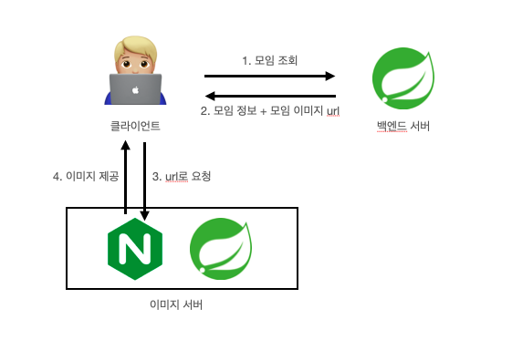 - 클라이언트가 백엔드 서버로 요청을 하면, 백엔드 서버가 이미지 서버로부터 이미지 파일을 가져오도록 구현합니다.