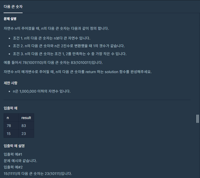 2. 현재 값 + 1 ~ 1000000까지의 수를 순차적으로 방문하면서 2진수 변환 및 2진수 개수 비교