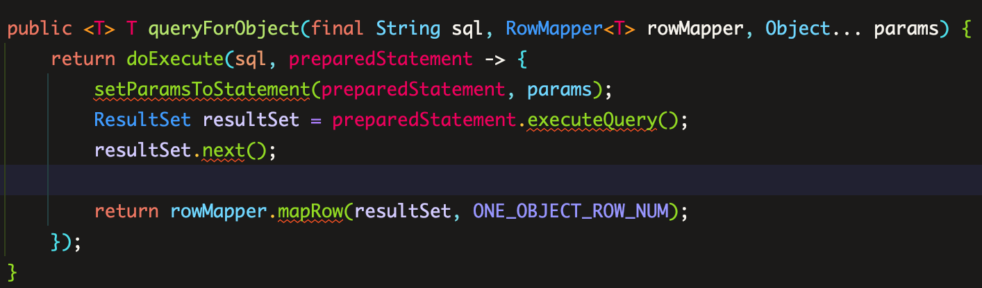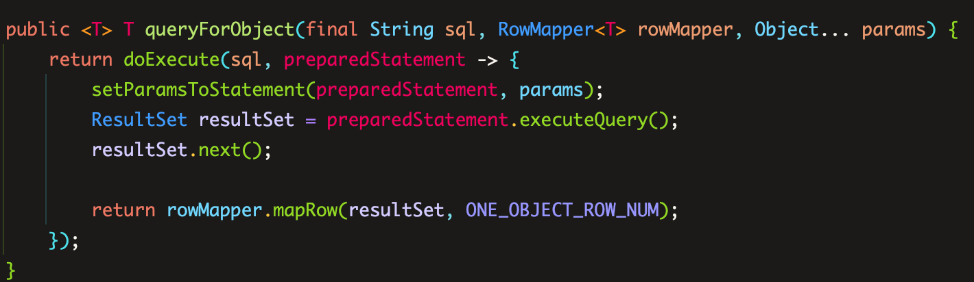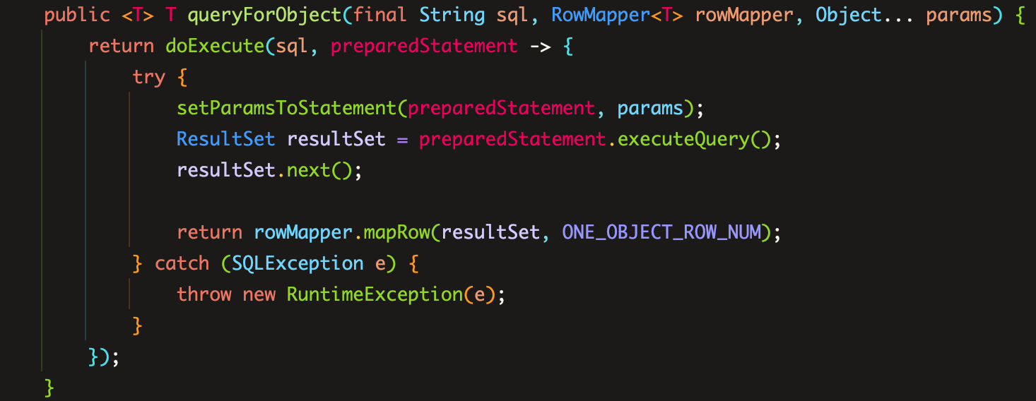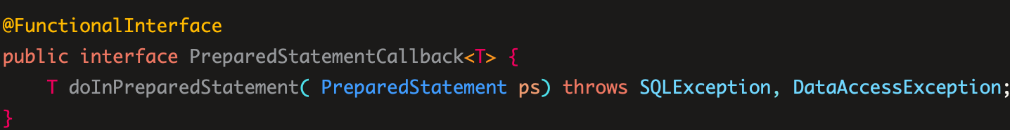 jdbc 템플릿을 직접 구현해보는 미션을 하다가 쿼리를 실행하는 모든 메서드에 try-with-resource가 있는 문제점이 발견되었습니다. 중복을 처리하기 위해 처음에는 try-with-resource 부분을 Function 함수형 인터페이스를 사용하여서 처리하도록 구현 해 보았습니다.