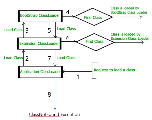 클래스를 불러올 때, Bootstrap Class Loader에서 찾을 수 없다면 Extension ClassLoader, Extension ClassLoader에서 찾을수 없으면 Application ClassLoader을 찾아 보고, 최종적으로 없다면 ClassNotFoundException이 발생합니다.